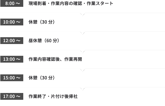 | 就業時間 | 8:00~17:00 ※現場によって時間は前後します |